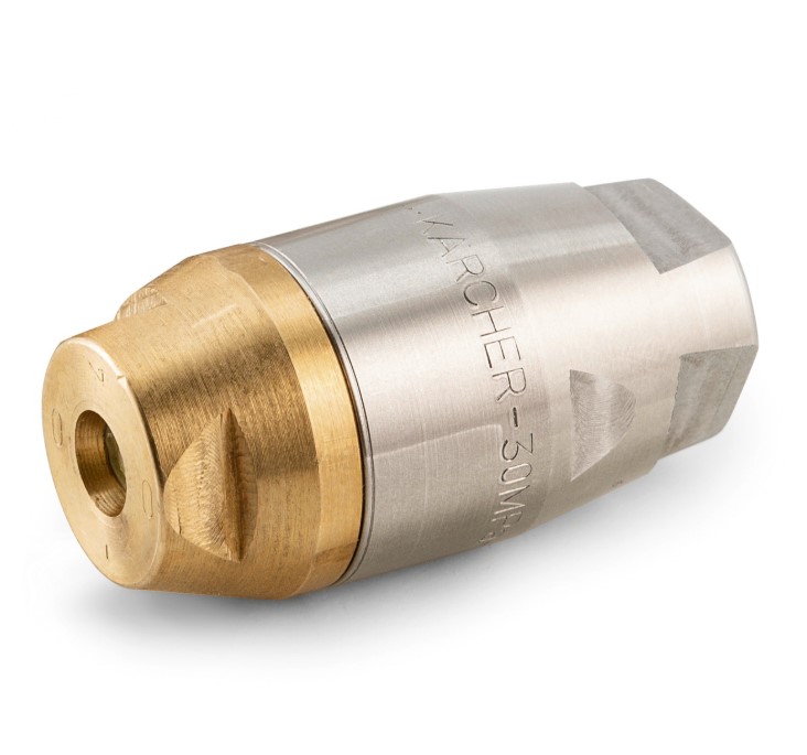 Innowacyjna i wysokowydajna dysza rotacyjna do czyszczenia rur (Ø 21 mm) łączy zalety dyszy rotacyjnej z właściwościami dyszy do czyszczenia rur. Obrotowy strumień rotacyjny, przechylony do przodu, usuwa nawet najbardziej uporczywy brud, natomiast trzy strumienie przechylone do tyłu pod kątem 30° zapewniają niezbędny ruch do przodu i łatwą obsługę urządzenia.